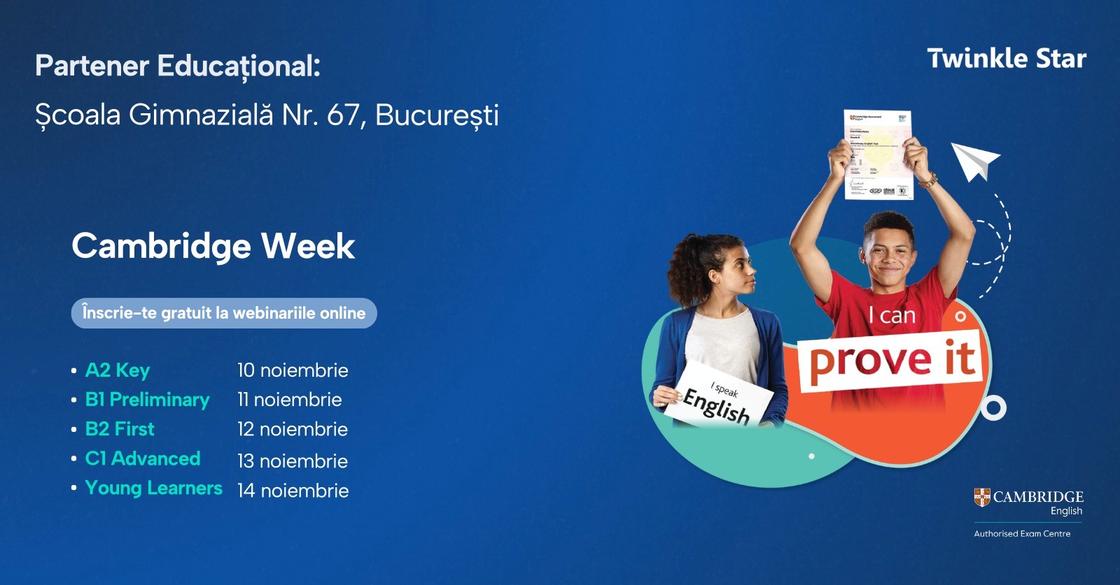 Suntem încântați să anunțăm parteneriatul nostru cu Twinkle Star – Cambridge English Educational Partner, în cadrul evenimentului CAMBRIDGE WEEK, o serie de webinarii interactive și gratuite, dedicate elevilor, părinților și profesorilor interesați de examenele Cambridge English.@Twinkle Star